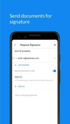 Signeasy е лесен начин за подписване на документи, попълване и подписване на формуляри и изпращане на документи за електронен подпис. Електронните подписи чрез Signeasy са законно обвързващи, осигурявайки безупречно управление и подписване на вашите документи, подкрепени от дигитална одиторска следа.