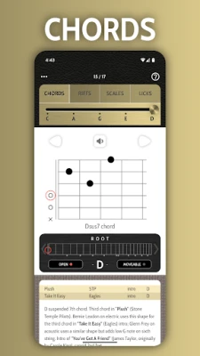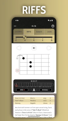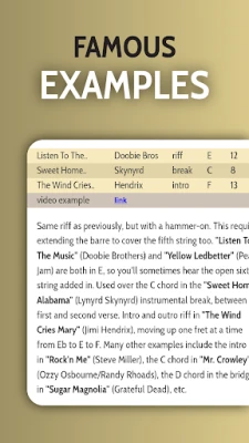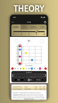 Всяка форма е представена с ясна визуална диаграма, придружена от детайлно описание, професионален звуков пример и списък с известни песни, които я използват. Червеният кръг указва основния тон, докато интерактивната карта на грифа под диаграмата показва неговото местоположение за различни тоналности. Чрез слушане и копиране на звуковите файлове, вие не просто учите, а развивате мускулна памет и усещане за китарата. Докоснете която и да е форма, за да активирате "Разширен режим", разкриващ визуално как се огъват струни и как са построени акордите – ключов елемент за свирене по слух и разбиране на музикалната теория, лежаща в основата на всеки звук.