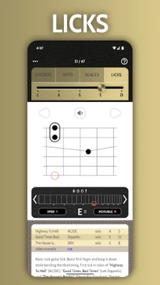 Всяка форма е представена с ясна визуална диаграма, придружена от детайлно описание, професионален звуков пример и списък с известни песни, които я използват. Червеният кръг указва основния тон, докато интерактивната карта на грифа под диаграмата показва неговото местоположение за различни тоналности. Чрез слушане и копиране на звуковите файлове, вие не просто учите, а развивате мускулна памет и усещане за китарата. Докоснете която и да е форма, за да активирате "Разширен режим", разкриващ визуално как се огъват струни и как са построени акордите – ключов елемент за свирене по слух и разбиране на музикалната теория, лежаща в основата на всеки звук.